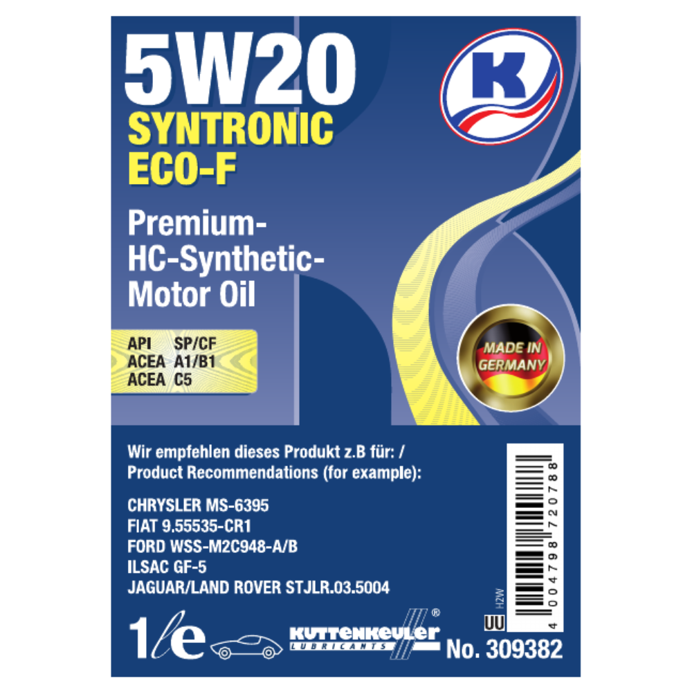SYNTRONIC ECO-F este un ulei de motor sintetic HC de înaltă performanță, avansat și extrem de eficient din punct de vedere al consumului de combustibil, care îndeplinește cerințele noilor motoare Ford EcoBoost. SYNTRONIC ECO-F respectă specificațiile Ford WSS-M2C948-A/B și este obligatoriu pentru motoarele EcoBoost. De asemenea, Ford recomandă acest ulei pentru motoarele care necesită specificațiile: WSS-M2C913-B, WSS-M2C913-C, WSS-M2C925-B.